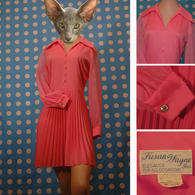 Underbar rosa 1960-tals miniklänning! Chiffonärmar. Strassknappar fram och på manschetten. Plisserad kjol. Karamell!!